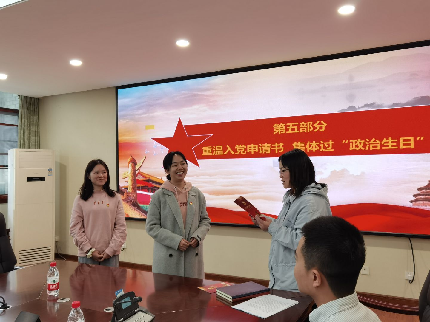 支部还为十一月入党的党员同志过政治生日,支部书记郑婷向五位同志赠送了生日贺卡和礼物“本人入党申请书复印件”,希望五位同志时刻牢记党的宗旨,不忘初心、牢记使命,永葆共产党员先进性。