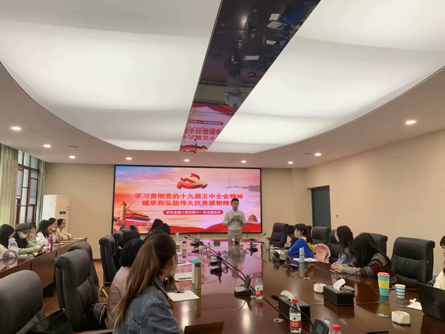11月18日中午,研究生第八党支部“学习贯彻党的十九届五中全会精神 继承和弘扬伟大抗美援朝精神”主题党日活动在师元楼208教室举行。支部全体党员及入党积极分子参加活动,支部书记郑婷主持。