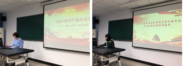 首先,由党员谢宛芸和谢昭仪展开微党课领学。谢宛芸以《讲好中国共产党的故事》为主题,从篇章简介、点赞优秀共产党员的故事、用好红色资源和传承红色基因三个部分说起。当讲到第三部分“用好红色资源、传承红色基因”——“在重庆”时,谢宛芸结合自己曾参加的“红岩精神”教育活动,说道:“当走到庄严肃穆的烈士陵墓前时,想到正是因为革命烈士义无反顾地牺牲自己的大无畏精神,才有中国的今天,内心就有一股热血在翻腾!”谢朝怡则以《学习习近平总书记在党史学习教育动员大会的重要讲话精神》为主题,从开展党史学习教育意义重大、开展党史学习教育要突出重点、在全党开展党史学习教育要务实求效三个方面展开微党课的讲授。