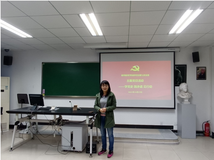 为庆祝中国共产党成立100周年,深入贯彻落实学校党委关于“学党史、践承诺、见行动”为师生办实事主题实践活动,紧扣庆祝建党100周年主线,大力营造奋进新时代、新使命、新征程、新担当展现新气象的浓厚氛围。2021年10月15日,76net必赢官网教师教育学院研究生第九党支部开展了以“学党史、践承诺、见行动”为主题的会议。会上,支部成员们认真交流学习体会,向支部报告“我为师生办实事”的具体事项、完成进度、下一步安排等情况,查找差距不足,进一步增强“四个意识”、坚定“四个自信”、做到“两个维护”。
