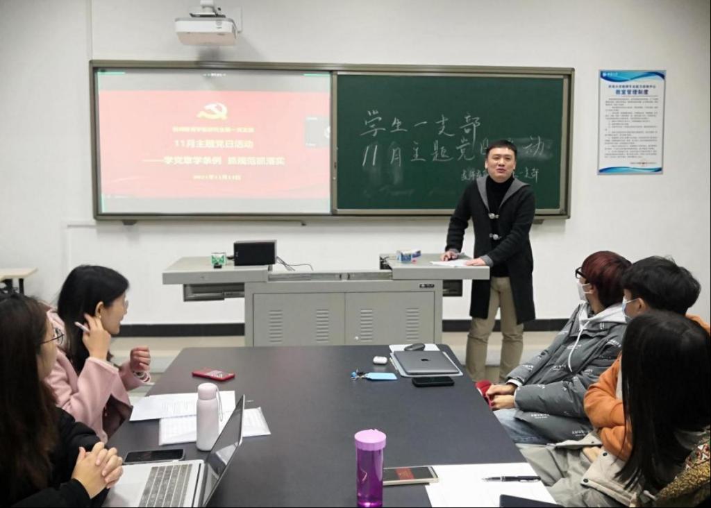 11月12日,围绕“学党章、学条例、抓规范、抓落实”主题,研究生一支部在师元楼103教室组织主题党日活动,支部书记邓磊主持。会前,支部书记邓磊安排一支部的新老同志进行自我介绍,并向大家简要汇报支委同志近期相关工作情况,以便后续活动顺利开展。随之带领大家开展党史学习,有力提高了同学们学党史、办实事、开新局的思想境界。