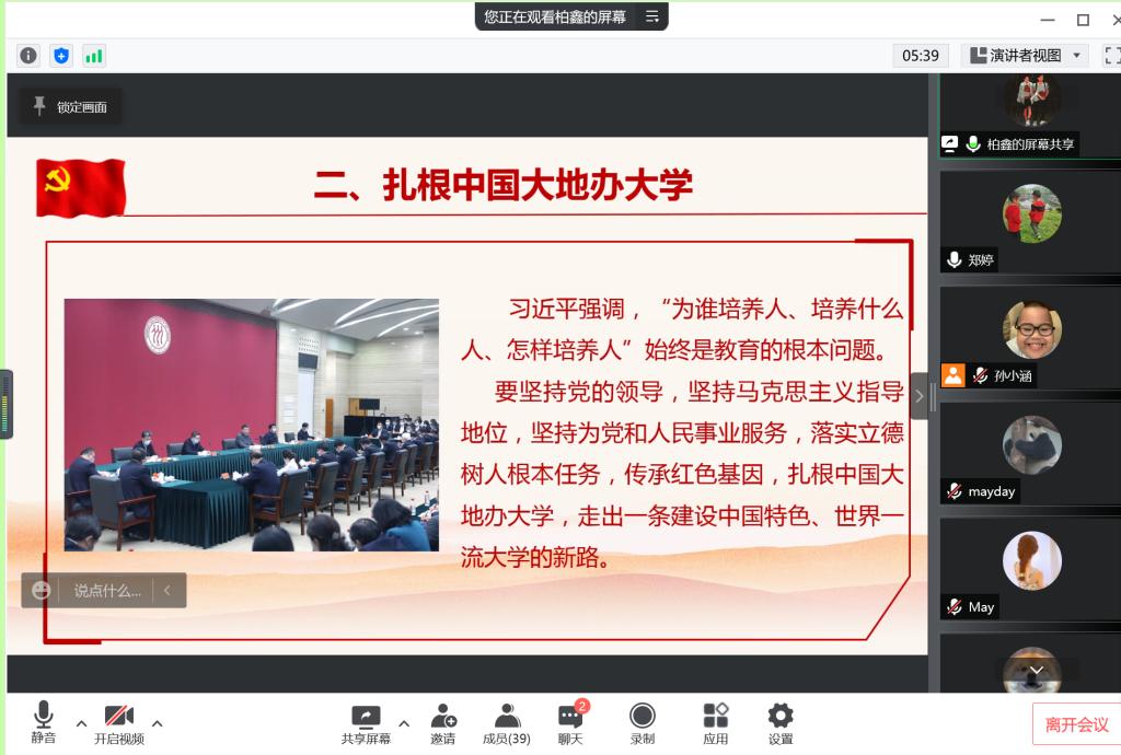 青春托举希望,奋斗开创未來。为了让研究生在青春的赛道上奋力奔跑,争取跑出当代青年的最好成績,迎接中国共产党二十大的胜利召开,5月13日中午,教师教育学院研究生第八党支部在腾讯会议视频上集中开展相关学习。