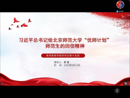 为深入学习贯彻习近平总书记的重要讲话精神,教师教育学院研究生第十党支部于2022年9月16日中午在腾讯会议开展“迎接党的二十大,强国有我向未来”主题党日学习活动。