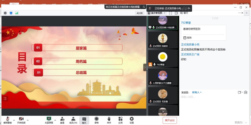 第二项议程,领学人曾小芮组织党员认真学习假期居家防疫知识,当好自身健康“第一责任人”。曾小芮从“居家篇”“用药篇”“总结篇”三个部分出发,号召党员在家中做好防护、科学用药、加强锻炼,提高自身抵抗力。