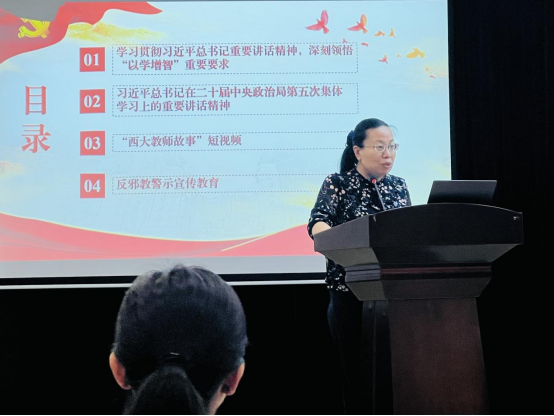 2023年6月2日,教师教育学院2023年第四次教职工政治理论学习活动在6教师元楼的师元讲堂顺利举行。本次学习活动主要包括四项内容:学习贯彻习近平总书记重要讲话精神,深刻领悟“以学增智”重要要求;习近平总书记在二十届中央政治局第五次集体学习上的重要讲话精神;“西大教师故事”短视频和反邪教警示宣传教育。教师教育学院全体职工参加。本次学习活动由郭亮书记主持,教工二支部纪检委员刘桂侠导读。