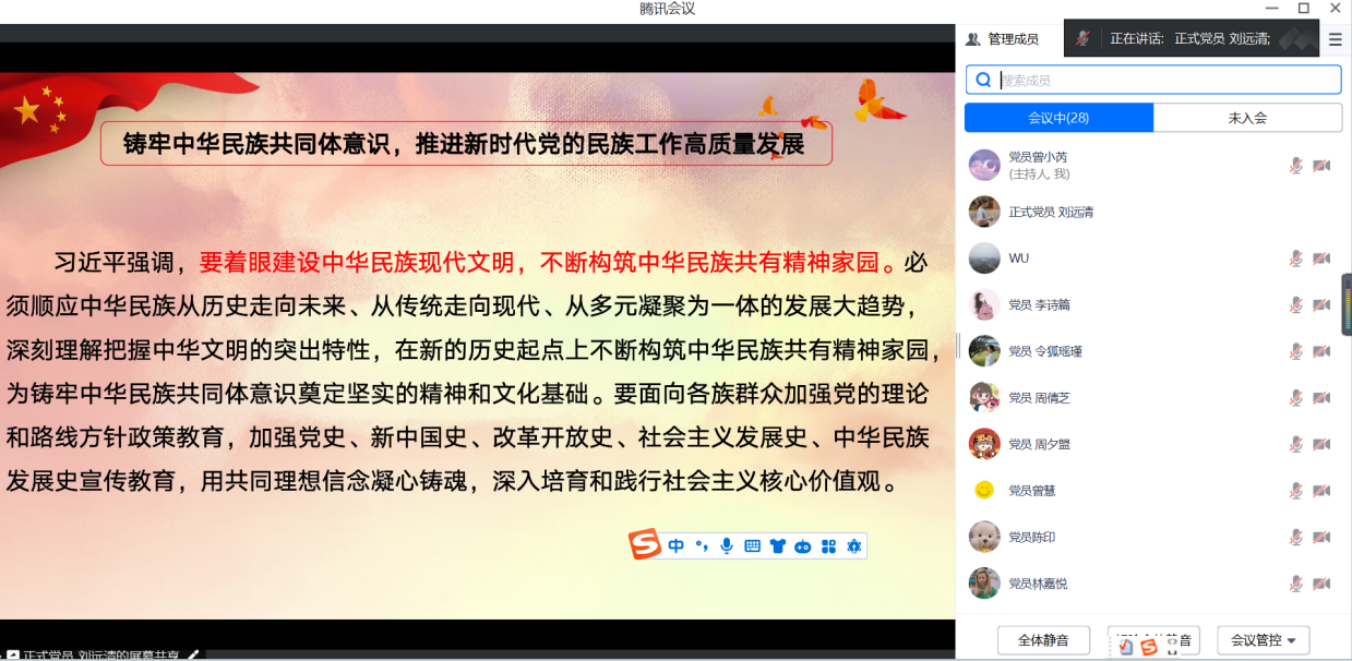 2023年11月10日,研究生第七党支部在腾讯会议开展了以“传承和弘扬爱国主义精神,铸牢中华民族共同体意识”为主题的十一月主题党日活动。活动由纪检委员曾小芮主持。