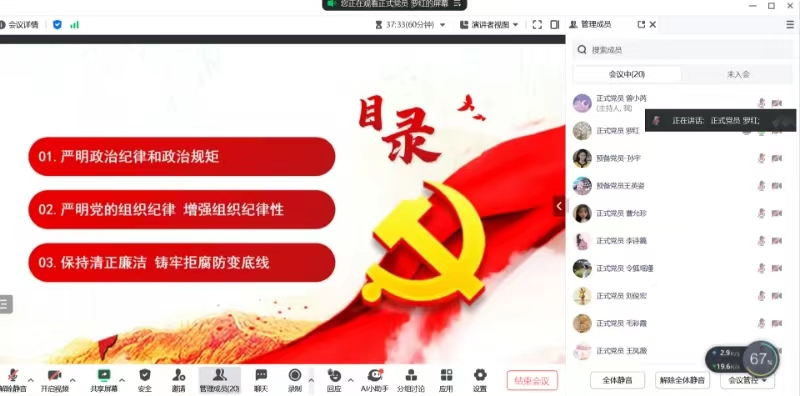 2024年5月17日,研究生第七党支部在腾讯会议开展了以“学党纪、听党话、跟党走”为主题的四月主题党日活动。活动由纪检委员曾小芮主持。
