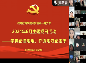 2024年6月22日上午,研究生第一党支部以“学党纪懂规矩,作遵规守纪表率”为主题开展了6月线上主题党日活动。支部书记邓磊出席本次会议,活动由支部组织委员杨琳同志主持。