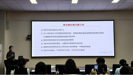 顾静老师介绍了支部委员会的基本构成与各委员主要职责,强调支委之间要“分工不分家”,加强内部协同配合,形成工作合力,共同推动支部工作有序开展。她指出,组织委员负责党务平台信息维护,包括新生党员信息录入、毕业生党员组织关系转接等,信息变动需及时请示支部书记,确保流程规范、信息准确;宣传委员需协助组织委员进行党员发展工作、做好会议记录、主题党日等组织生活的影像与文字记录;纪检委员则协助开展党员发展相关工作、日常负责党费收缴、组织生活考勤等事务,保障支部纪律执行到位。