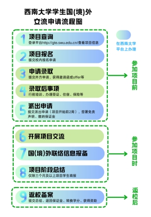 1. 根据如下图示完成项目申请、派出、返校等流程。(提交报名表后,请关注申请流转记录(平台-个人中心):