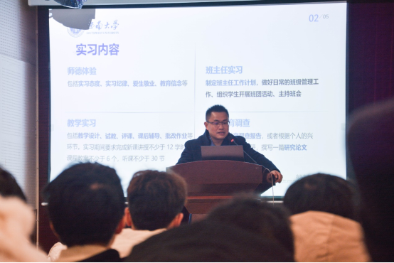 然后,胡航老师介绍了我院教育实习的具体时间安排和规划,实习过程中所需要完成的任务和成绩构成,以及实习指导老师和领队老师的构成。胡航老师着重强调实习过程中的纪律问题,他嘱咐所有同学在实习的过程中要严格遵守实习学校纪律和规章制度,保持谦虚谨慎的态度,多向带教老师请教学习,与学生多交流多合作,认真完成指导老师交代的各项工作,圆满完成实习任务。