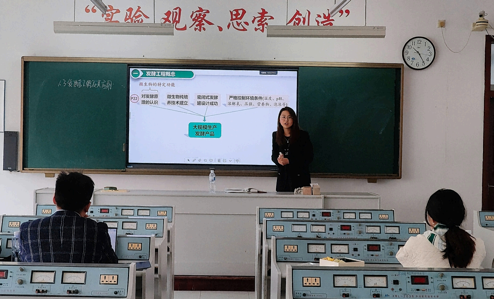 然后,邓磊、曹宗清、王雨薇老师进行无生微课指导。大连市金州高级中学的15名实习生一共被分为三组,对应三名巡回指导老师,开展了每人15至20分钟左右的有生及无生试讲。讲课过程中,同学们各尽其能、各展其才,充分展现了两个月以来的实习成果。