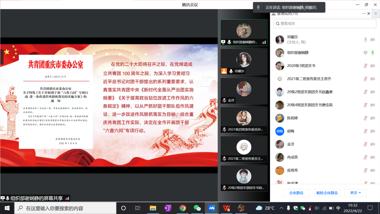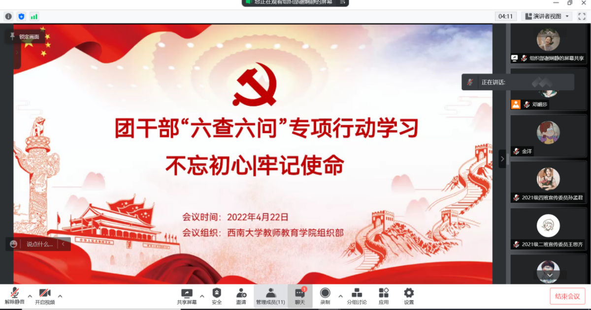 为深入学习宣传贯彻习近平新时代中国特色社会主义思想,特别是习近平总书记关于青年工作的重要论述和工作要求,全面贯彻落实重庆市委五届十一次全会精神、团十八届六中全会精神和团市委《关于开展团干部“六查六问”专项行动进一步改进作风狠抓落实的实施方案》精神,全面改进新时代共青团干部作风形象,教师教育学院团委于4月22日晚7点召开团干部“六查六问”专项行动部署动员会,并进行第一次集中学习。团委书记郑婷出席会议,团委副书记、团委组织部、宣传部负责人、各团支部团支书、组织委员、宣传委员参加会议。会议由组织部干事邓媚莎主持。
