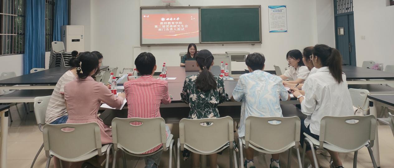 5月29日,学院第三届团委研究生会各部门负责人竞聘面试在师元楼101教室成功举办。本次面试以线上与线下相结合的形式进行,共计十六位竞聘者参与,研究生会现任主席团、团委副书记、各部门负责人以及新一届研究生会主席团与团委副书记担任本次面试的考核官。