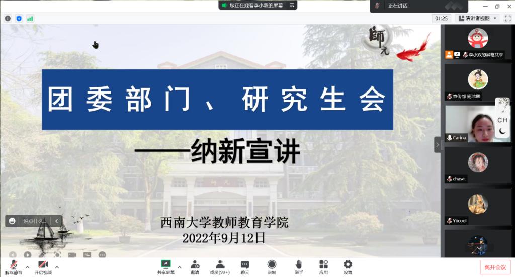 为充分发挥学生的主体作用,确保学生工作可持续良性发展,同时也为给2022级新生提供一个锻炼自我、展示自我、提升自我的平台。9月12日晚,教师教育学院第三届团委研究生会招新宣讲活动于线上圆满举办。活动由教师教育学院研究生会学术部部门负责人李小双主持,2022级新生辅导员刘黎老师,教师教育学院团委副书记文国量、谢娴静,教师教育学院研究生会执行主席郭利娇、徐耀庭、苏佳及各部门负责人出席活动,2022级全体研究生参与。