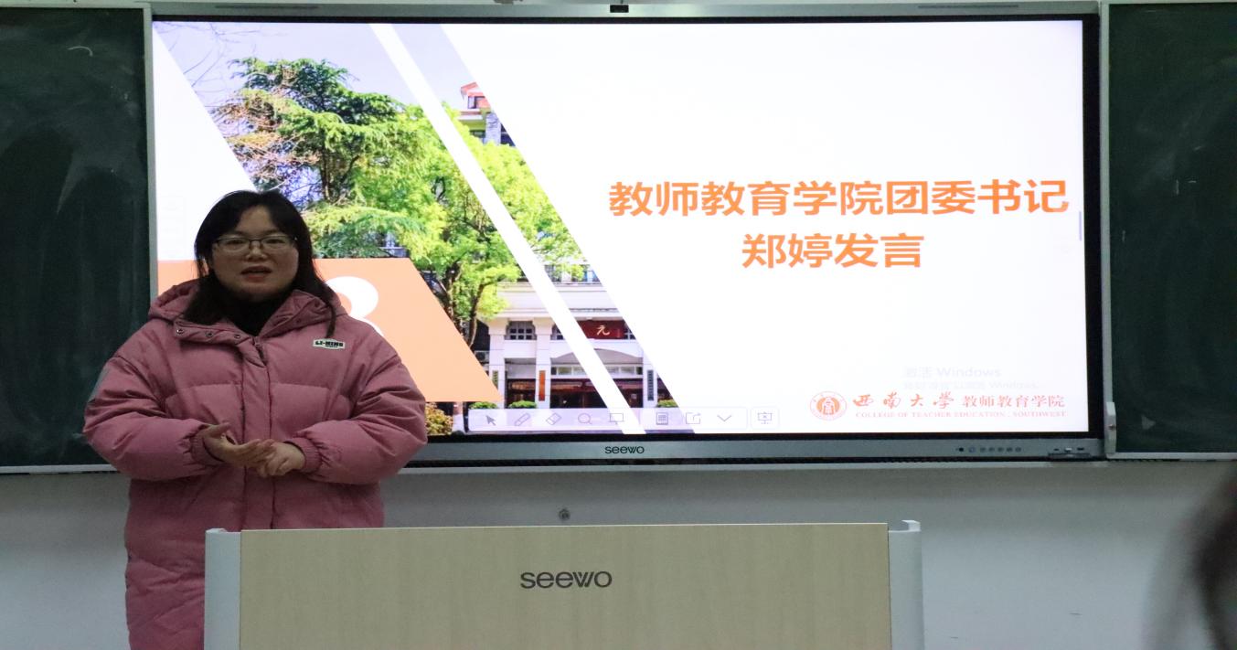 紧接着,团委书记郑婷老师以“感谢”、“成长”两个关键词展开讲话,对过去的一年里,研会成员的辛勤付出表示感谢,也看到了大家进入研会后的成长。希望团委研会再接再厉,茁壮成长,祝福同学们身体健康,龙年顺利。
