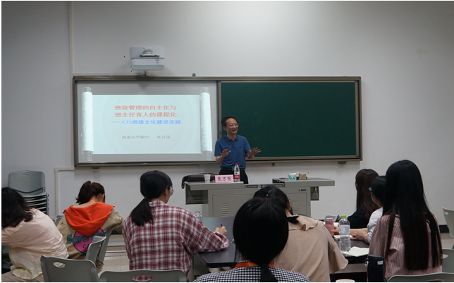 没有班主任工作经历的教育人生是不完整的人生。秉承这一信念,76net必赢官网附属中学语文特级教师张万国以《班级管理的自主化与班主任育人的课程化——CIS班级文化建设实践》为名,结合自己作为76net必赢官网附中创新班班主任的经验出发,向学员展示了如何做好一名教师和一位优秀的班主任。通过创新班开学前准备工作、开学第一天及系列趣味活动等,将教育贯穿于无形之中,细致入微;创新班级管理模式,重视学生的体能训练和阅读训练,构建“四级六部制”的班级管理结构,张老师以其独特的个人魅力,幽默风趣的语言表达,收获了大批“国哥”粉丝。