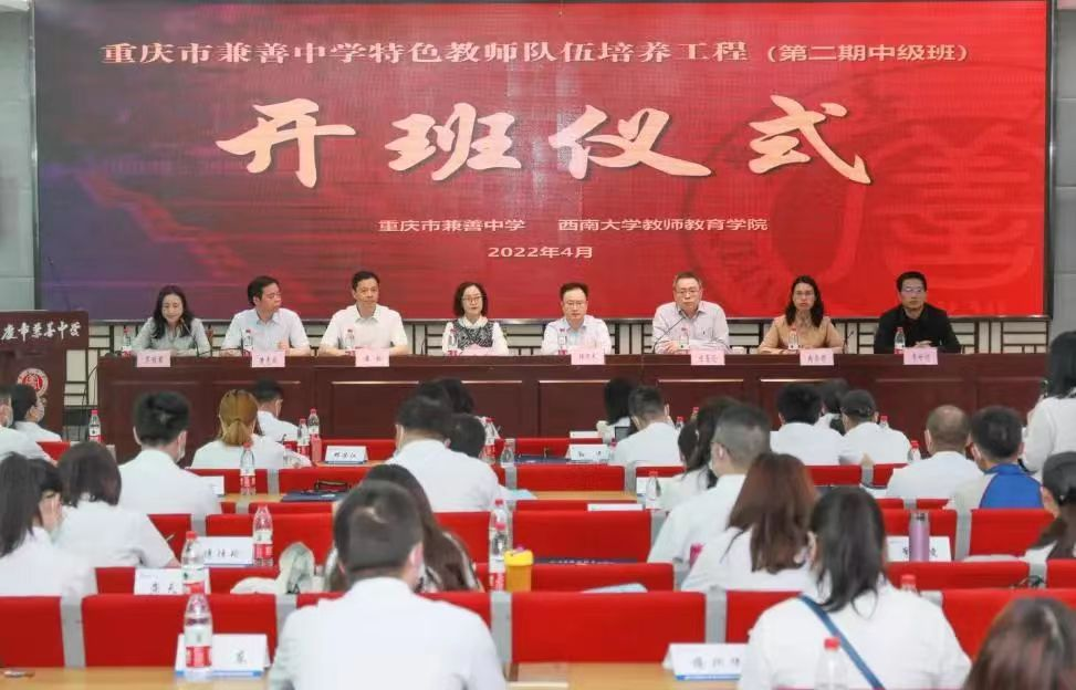 4 月22 日, 重庆市兼善中学特色教师队伍培养工程中级班( 第二期) 开班仪式圆满落幕。70 名学员齐聚兼善中学北区学术报告厅,与专家对话,与同仁交流。区教委副主任杨万长, 区教师进修学院院长饶英, 76net必赢官网教师教育学院院长陈恩伦、副院长李世讴、院长助理兼继续教育办公室主任罗丽君, 兼善中学党委书记、校长潘松, 党委副书记黄虎成, 副校长冉崇娟等出席本项目开班仪式。