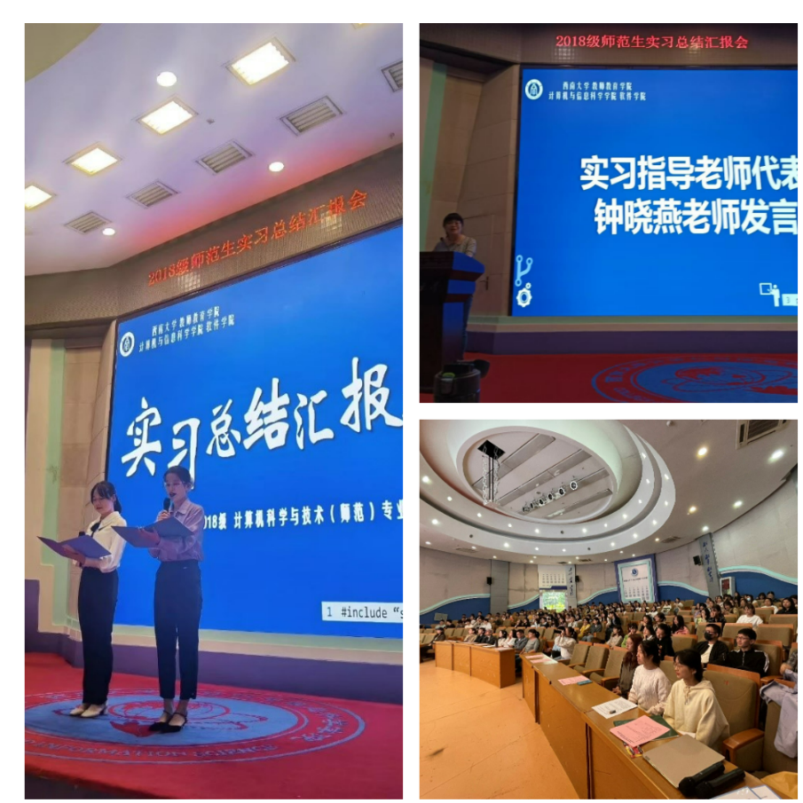 首先,教师教育学院钟晓燕老师代表全体实习指导教师对2018级计科(师范)专业实习工作进行了回顾和总结。钟老师参与了2018级计科师范专业实习的全过程,陪伴大家完成了整个实习工作,见证了同学们的成长,肯定了同学们的进步。与此同时,她也对全体同学提出希望,希望大家能够继续努力,并深信大家一定能够成为有理想信念,有道德情操,有扎实学识,有仁爱之心是四有好老师。