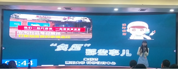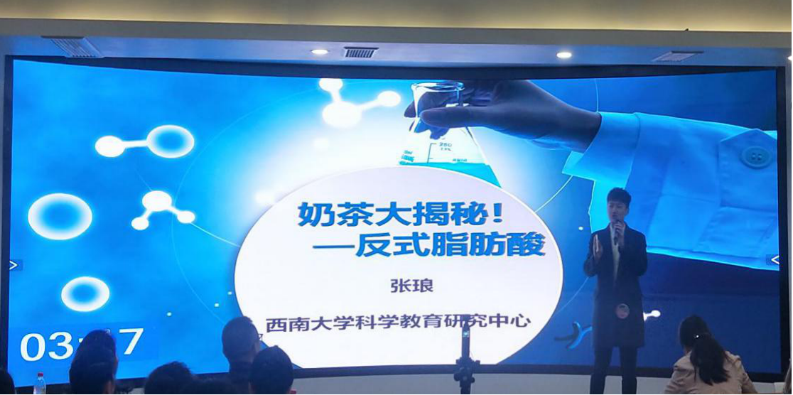 我院首先上场的是张琅同学,他讲解的题目是“奶茶大揭秘”,利用生活中大家都喜欢喝的奶茶为主题,吸引评委老师和观众的注意力,随后,他讲解了奶茶中关键成分反式脂肪酸以及该成分在其他美食的含量,最后为大家提供了两条生活小贴士,鼓励大家更加健康地生活。