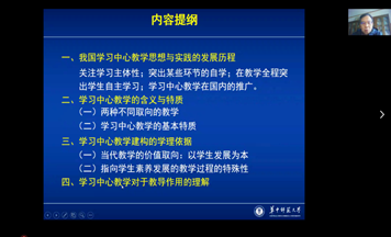 2021年4月10日上午9:00-11:00,我院特邀请华中师范大学二级教授,课程与教学论专业博士生导师陈佑清开展了《学习中心教学的建构》专题云讲座。本次讲座由皇甫倩副教授主持,受到了教师和学生的广泛关注,在线人数将近200人。