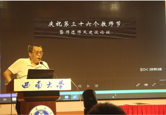 随后,原重庆市教委副巡视员李源田、学校经济管理学院王志章教授以“立德树人铸师魂,爱国荣校有担当”为主题作了专题报告。76net必赢官网附属中学校长、党委副书记欧健,学校基础教育集团董事长邹顺康教授、76net必赢官网附属小学于宏老师,学校教师教育学院党总支书记郑家福教授、董小玉教授、杨晓钰教授作了专题发言。专题报告和专题发言环节分别由教师教育学院院长陈恩伦、教师发展研究院副院长荣维东主持。