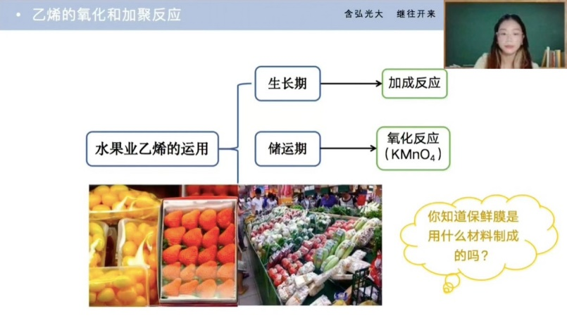 我院2021级学科化学硕士周筱雯在黄梅教授指导下,制作的微课《水果业中的魔法师——乙烯》中,通过利用乙烯在生长期、储运期、售卖期三个阶段中的具体作用,逐层剖析乙烯的化学性质,并将化学课堂与实际生活紧密相连。整个教学过程环环相扣,饱含趣味性和科学性。