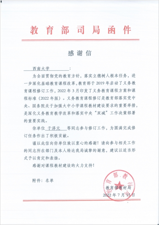 近日,教育部教材局向学校发来感谢信,对教师教育学院教师于泽元、任明满、张廷艳、荣维东、廖伯琴,体育学院教师彭莉在义务教育课程修订期间参与修订,圆满完成修订任务表示感谢。