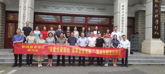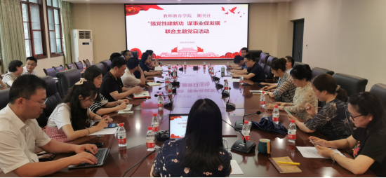 为推动学习贯彻习近平新时代中国特色社会主义思想主题教育走深走实,创新主题党日活动形式,着力推进党建与事业发展“一融双高”新格局,6月9日,教师教育学院教工一支部与期刊社联合举行主题党日学习活动。本次学习主题是“强党性建新功 谋事业促发展”,联系教师教育学院的党员领导干部、培训与基础教育管理处处长尹晓东、期刊社社长张陈、副社长吴淑爱、教师教育学院党委书记郭亮、党委副书记陈铮、副院长杨挺、党委办公室组织员顾静、期刊社第三党小组成员以及教师教育学院教工一支部党员同志参会。教工一支部书记陈亮同志主持活动。