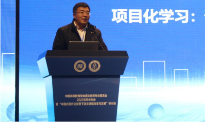 郑国民教授在以《项目化学习:课程与教学实施的路径探索》为题进行分享,里他指出,现在的语文学科出现了内容碎片化、学习过程同质化、思维培养浅表化、学习评价单一化等问题。这就需要语文教育界进行项目式学习的探索,变革课程内容观念,优化课程内容的组织与呈现,以促进学习方式的转变;实施课程内容的探索与突破,以学习任务群统领教和学的突破,整合学习情境、学习内容、学习方法、学习评价、学习资源。