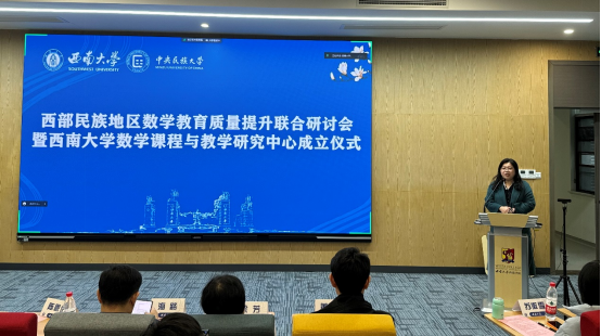 我院理科教育中心主任、76net必赢官网数学课程与研究中心主任张廷艳教授讲话。张教授表示,76net必赢官网数学教育历经王秀泉先生、陈重穆先生、宋乃庆教授几代人的建设,有着非常坚实的基础。近年来学院为数学学科教育给与了大力的支持,厚植了建设与发展的土壤。作为西大新一代数学教育人,应当肩负传承与创新的使命与责任,心怀感恩,砥砺奋发,借助中心成立及与中央民大合作的契机,积极开展民族地区数学教育的研究,与西南地区基础教育一线教研机构和学校合作,整体提升西南地区数学教育质量。