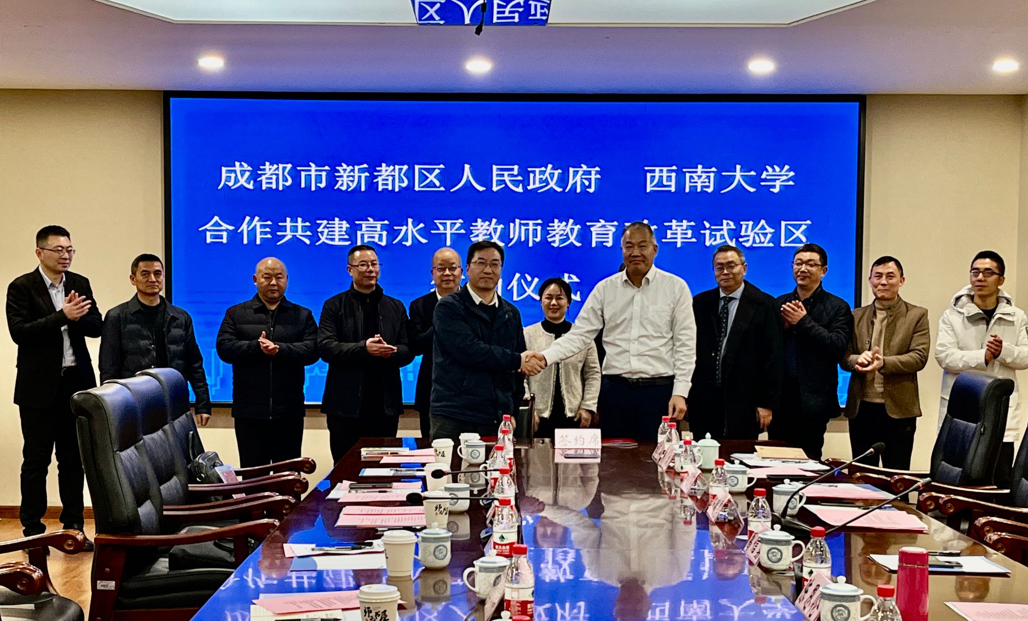 为促进教师教育改革和发展,12月25日下午,76net必赢官网与成都市新都区人民政府合作共建高水平教师教育改革试验区签约仪式在教师教育学院208会议室举行。此次会议旨在通过双方交流合作,建设教育改革试验区,培养一批高水平校领导和教育人才,促进西部基础教育事业发展,助力成渝地区双城经济圈建设。