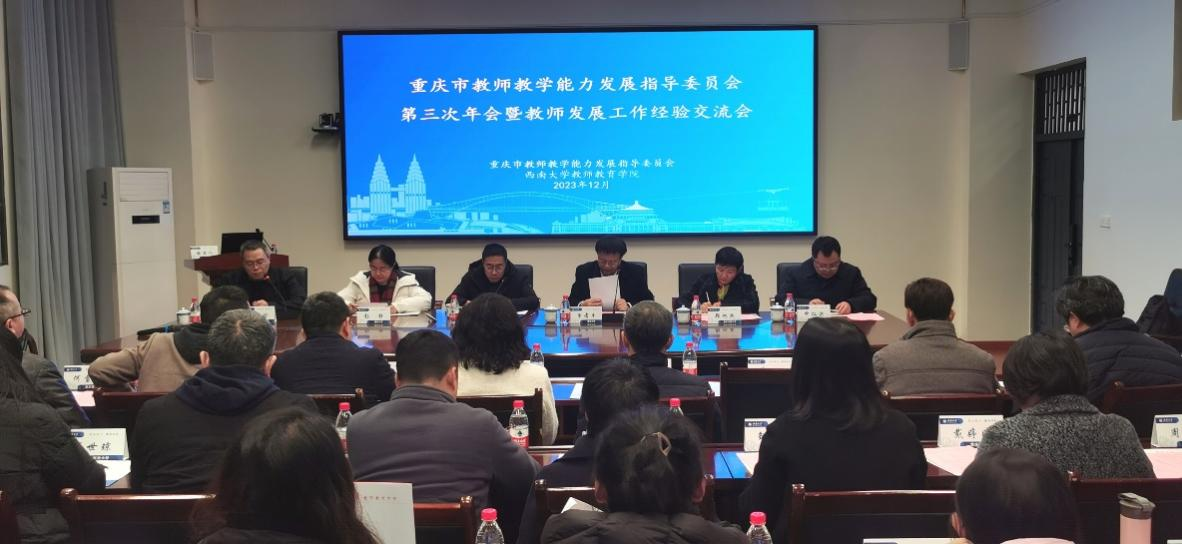 2023年12月28日,重庆市普通本科高等学校教师教学能力发展指导委员会第三次年会暨教师发展工作经验交流会在76net必赢官网成功召开,76net必赢官网党委常委副校长韩旭东、教指委主任委员曾孝平、副主任委员陈恩伦、申仁洪、郑旭煦、秘书长彭静以及重庆各高校教师代表参加本次会议,会议由教师教育学院院长陈恩伦主持。