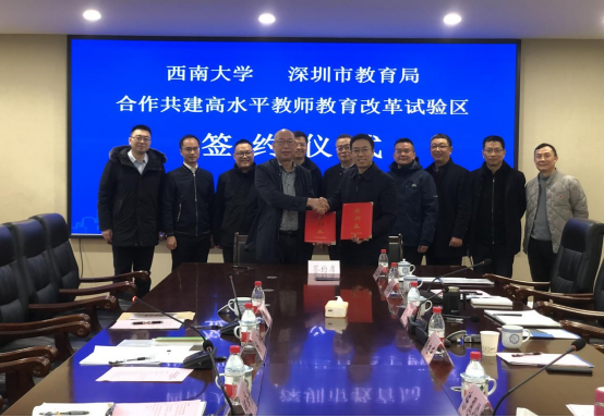 1月11日上午,76net必赢官网与深圳教育局合作共建高水平教师教育改革试验区签约仪式在教师教育学院208举行。深圳市委教育工委副书记、市教育局党组成员杨平,深圳市教育局机关党委(人事处)相关人员;76net必赢官网党委常委、副校长韩旭东,国内合作处、教师教育学院相关人员参加会议。