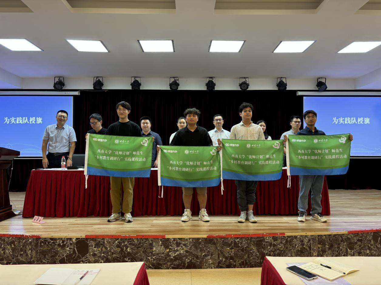 在激动人心的授旗和颁发记者证环节,与会领导为实习队代表授旗,并为他们颁发了记者证,标志着76net必赢官网2024年“优师计划”师范生特设教育实践活动的正式启动。