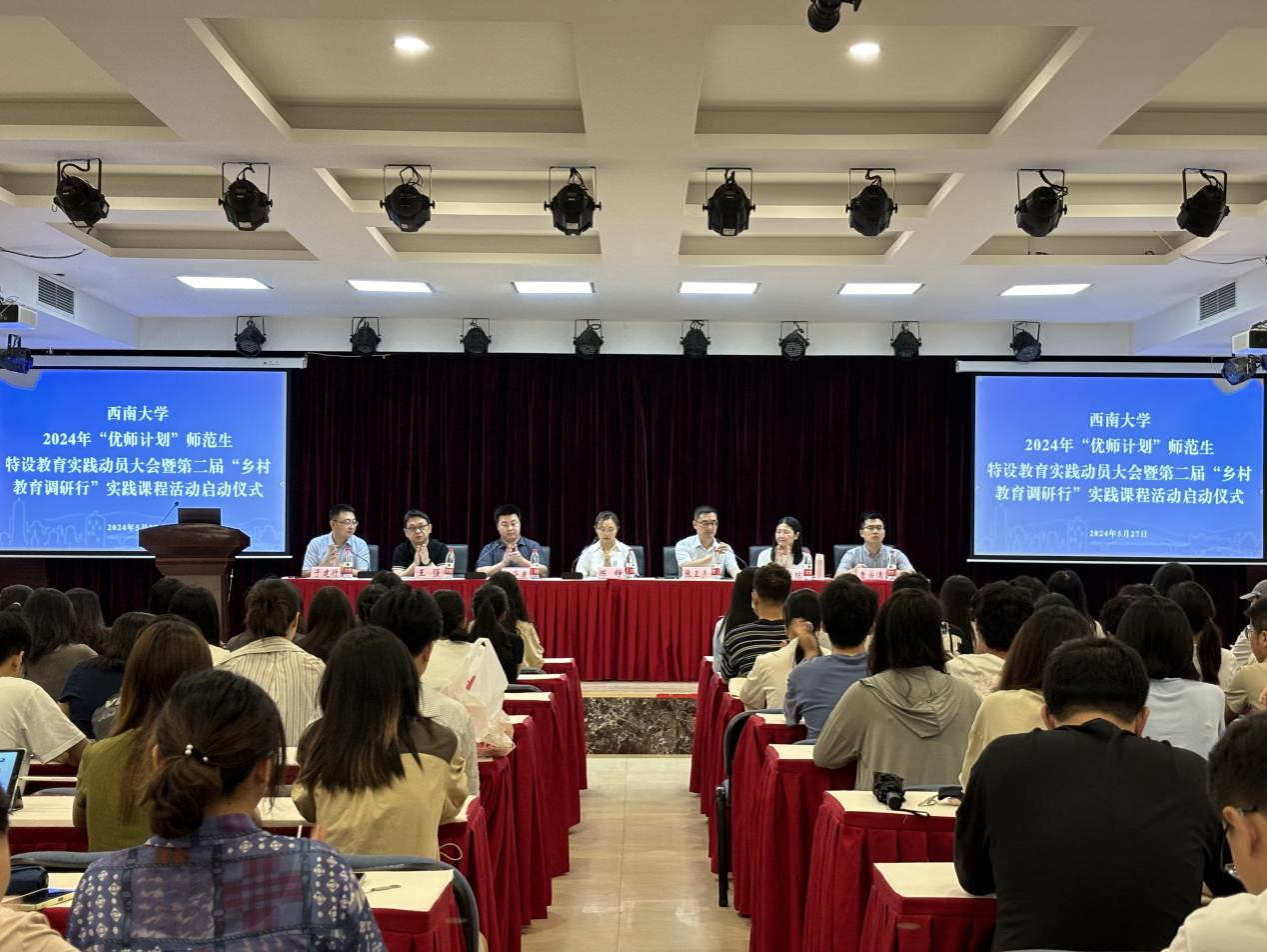 2024年5月27日上午,76net必赢官网教师教育学院师元楼师元讲堂内气氛庄重而热烈,一场旨在激发“优师计划”师范生教育实践热情的动员大会在此举行。教师教育学院党委副书记陈铮、副院长张正严,带队教师蹇世琼、王强、曹宗清以及10位研究生党员助理出席会议。大会还特别邀请了《课堂内外》杂志社代表陈华康,为即将参与特设教育实践的“优师计划”师范生们带来鼓励及媒体支持。会议由教师教育学院师范生实践教学中心主任于建行主持。