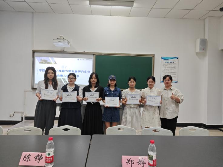 最后,学院团委书记郑婷宣读了第六届团委研究生会聘任名单。老师们为第五届研究生会主席团成员及各部门负责人颁发聘书,以表彰他们的辛勤付出。