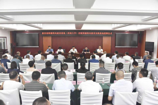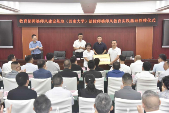 仪式上,涪陵区委教育工委专职副书记华斌致辞,代表涪陵区教委表达了对罗生全教授、郑家福教授的欢迎和感谢,并指出了此次授牌的重要意义。随后,由郑家福教授代表教育部师德师风基地(76net必赢官网)授牌,华斌书记代表涪陵区教育委员会接牌。