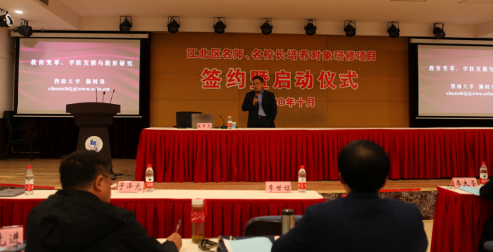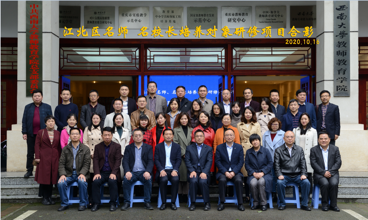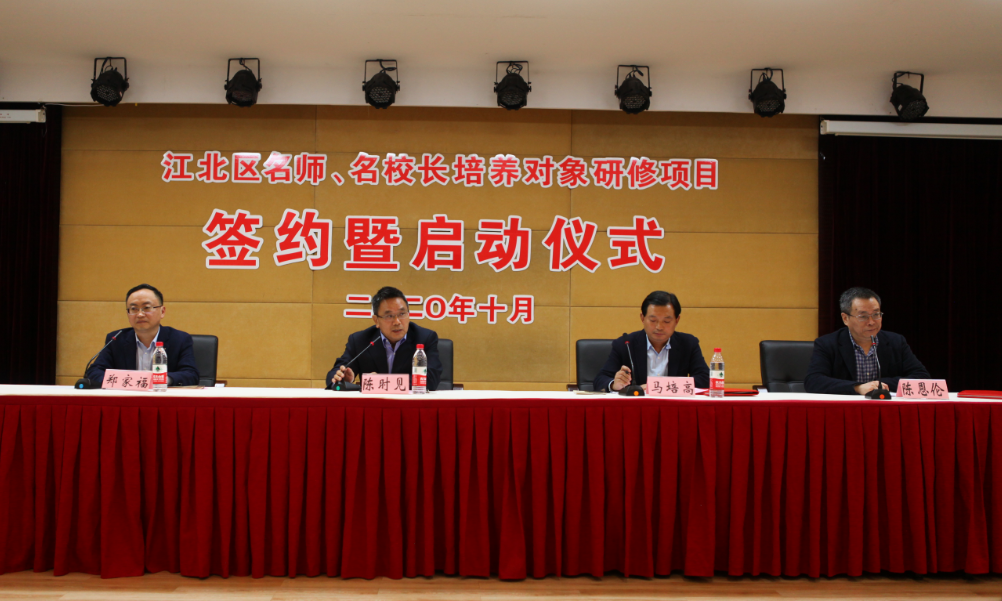 丹桂飘香、金风送喜。2020年10月16日,江北区名师、名校长培养对象研修项目签约暨启动典礼在76net必赢官网隆重举行。76net必赢官网副校长陈时见、江北区教育党工委书记、教委主任马培高、教师教育学院党总支书记郑家福、院长陈恩伦、党总支副书记张学斌、副院长李世讴、继续教育办公室主任罗丽君、知名教授团队及全体名师、名校长培养对象出席项目启动典礼,典礼由郑家福主持。